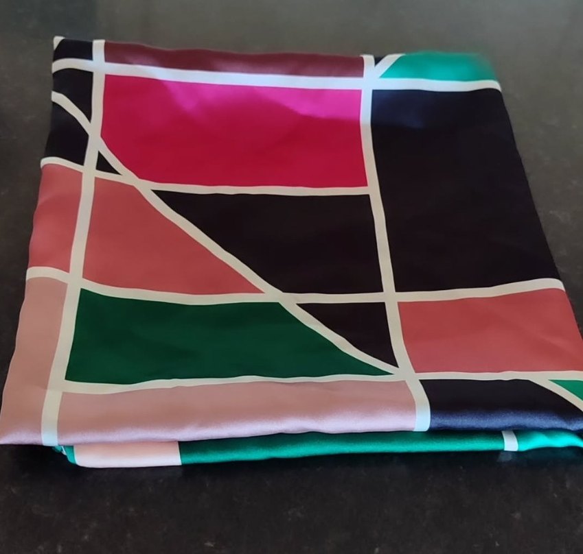 Kadınlar için çok renkli, drapeli ve modern geometrik desenli, yumuşak sentetik kumaştan şal. Avant-garde tarzını yansıtır.