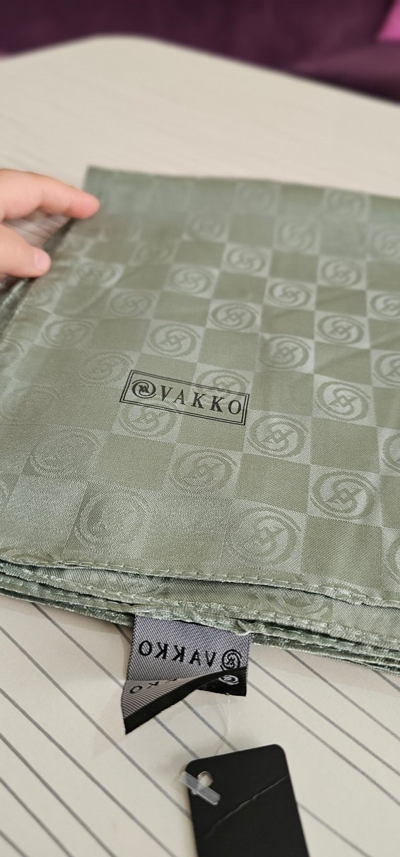 Vakko markalı, fermuarlı, haki renkte, desenli ve yumuşak sentetik kumaştan kadın şalı.