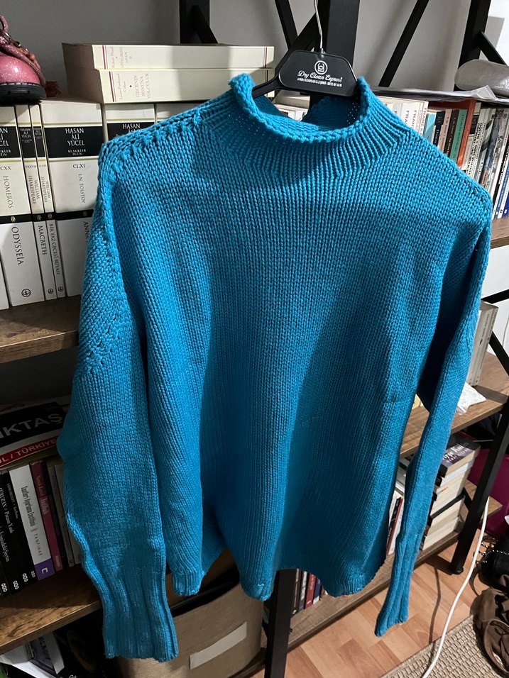 Kadınlar için örme, parlak mavi renkte, boğazlı ve uzun kollu kazak. Bol kesim ve midi boyda, günlük kullanım için uygun.