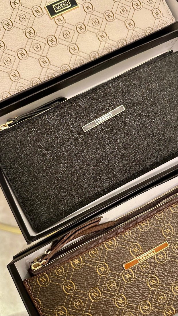 Siyah deri fermuarlı clutch cüzdan, baskılı desene sahip, modern klasik tasarımıyla günlük kullanıma uygun.