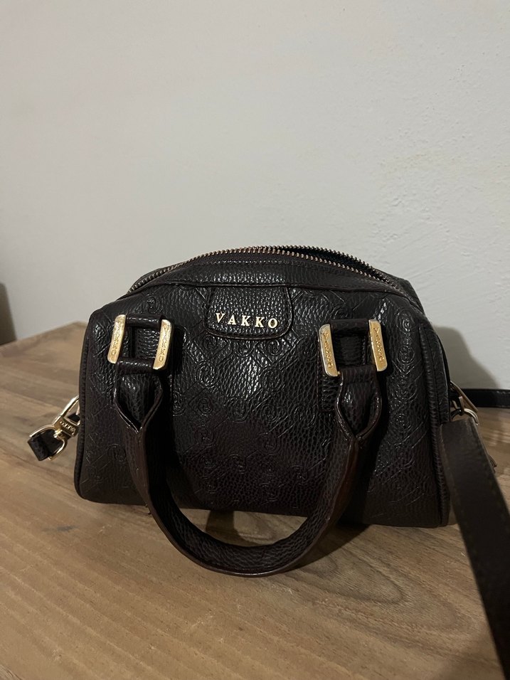 Vakko marka kahverengi deri kadın çanta, deseni ve tokalı saplarıyla cesur sokak stili için uygun.