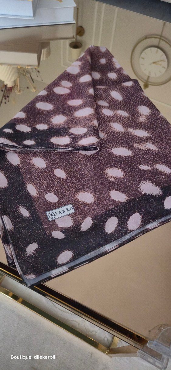 Vakko markalı kadın şal, kahverengi üzerine açık renk puantiyeli, sentetik kumaştan drapeli tasarıma sahip. Modern ve şık bir görünüm sunar.