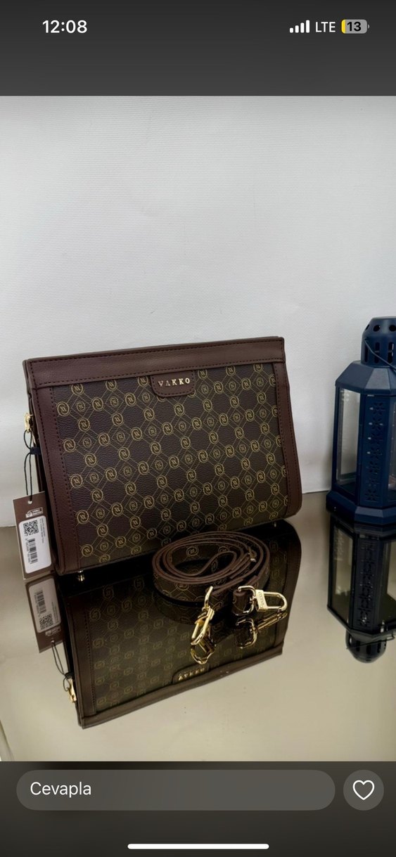 Kahverengi deri, baskılı desene ve kemerli tasarıma sahip Vakko kadın çanta. Modern klasik stil, iş ve günlük kullanım için uygundur.
