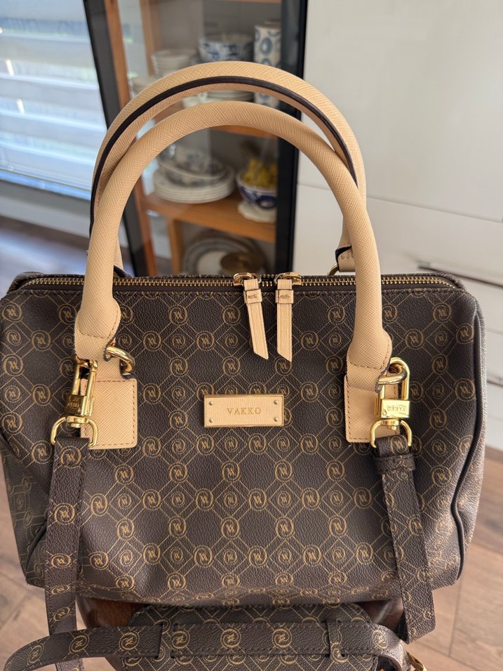 32/24 cm boyutlarında Orjinal hiç kullanılmamış Vakko marka, koyu kahverengi baskılı deriden üretilmiş, tokalı detaylara ve bej saplara sahip kadın çantası. Modern klasik tarzda, günlük iş kullanımı için uygundur.
