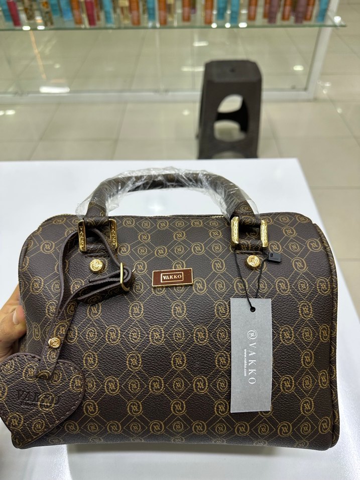 Vakko marka kahverengi deri kadın çanta, baskılı desen ve tokalı saplarıyla modern klasik tarz sunar. Parlak yüzeyi günlük kullanıma uygundur.