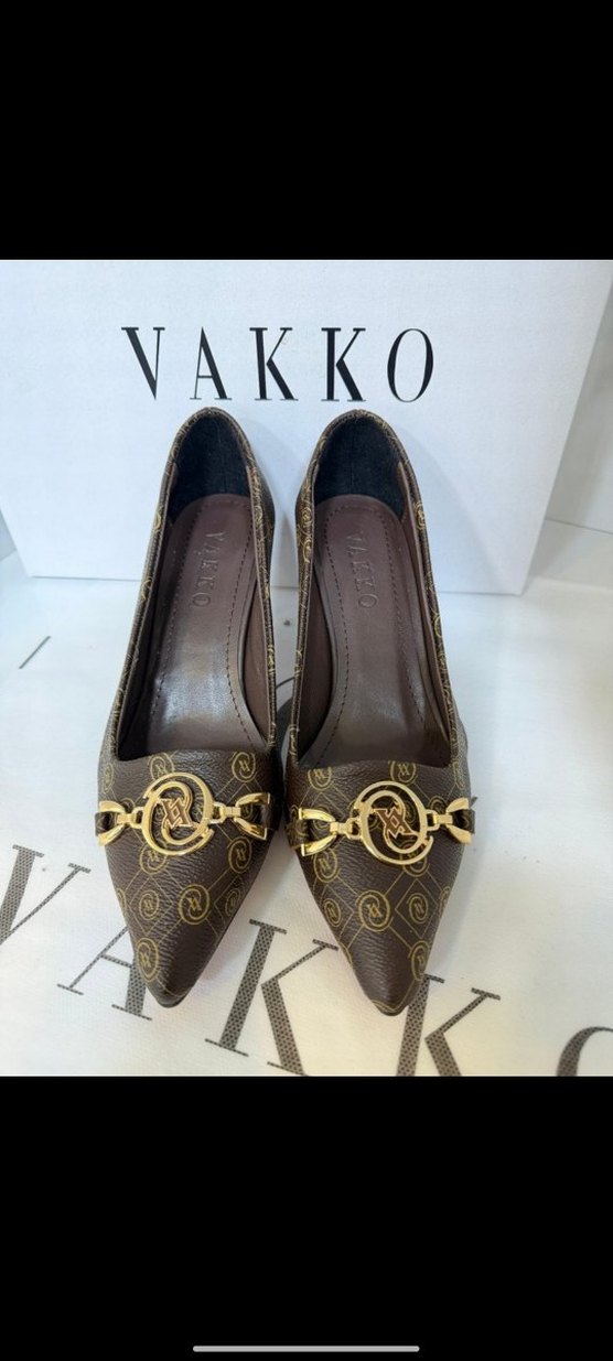 Vakko marka, parlak kahverengi deri stiletto kadın ayakkabı. Yılan derisi desenli ve tokalı, modern klasik tarzda, günlük kullanım için uygun.