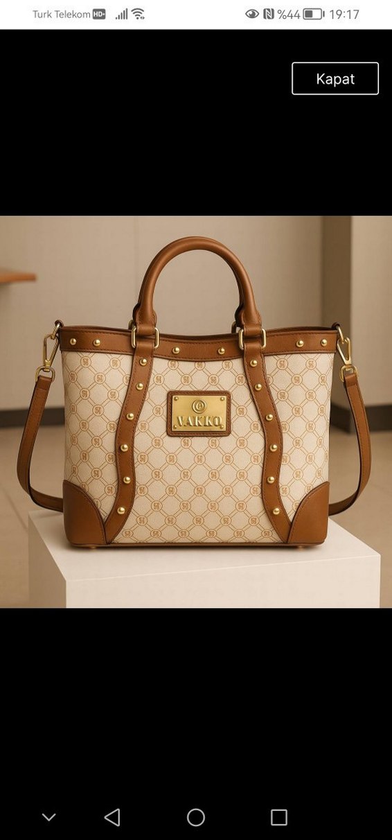 Vakko marka vintage çanta Parlak yüzeyli, baskılı desene sahip bej deri kadın çantası, kahverengi tokalı detaylar ve altın tonlu donanımlarla modern klasik tarz sunar.