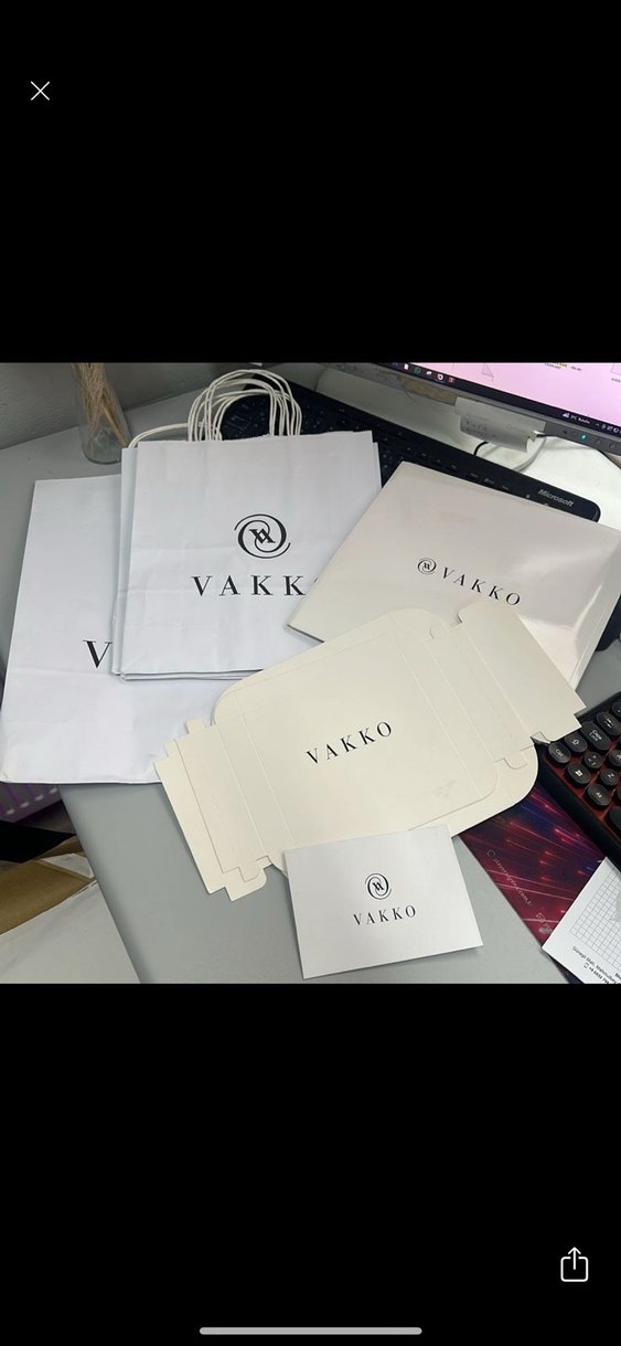 Vakko logosu gri renkte olan beyaz kağıt çanta ve kutu seti. Düz, katlanmış ve monte edilmiş ürünler markalıdır. 1 adet fiyatıdır