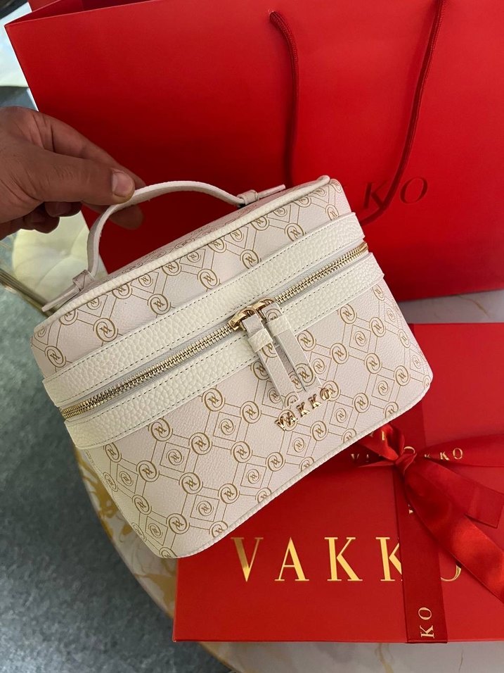 Beyaz deri çanta nakışlı detaylar ve fermuarlı kapama sunar. Günlük kullanım için uygun, gösterişli ve klasik şıklık tarzında, hafif renkli ve sokak modası etkili. VAKK logosu mevcuttur.