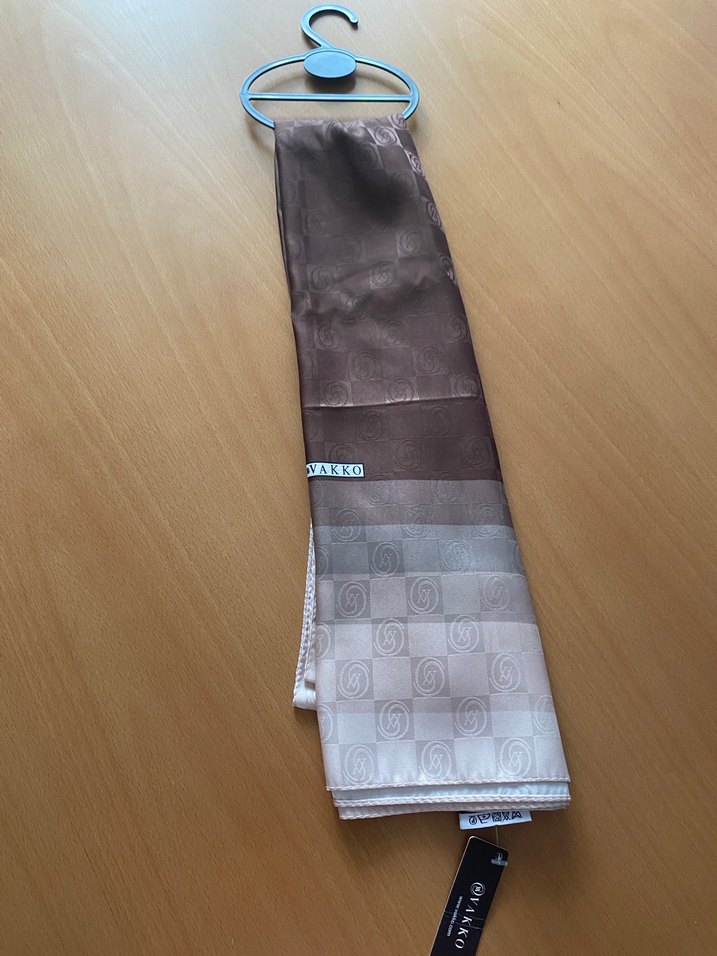 Vakko marka kahverengi kadın fular, yumuşak sentetik kumaştan ve şık desene sahip. İş ve sokak modasına uygun.