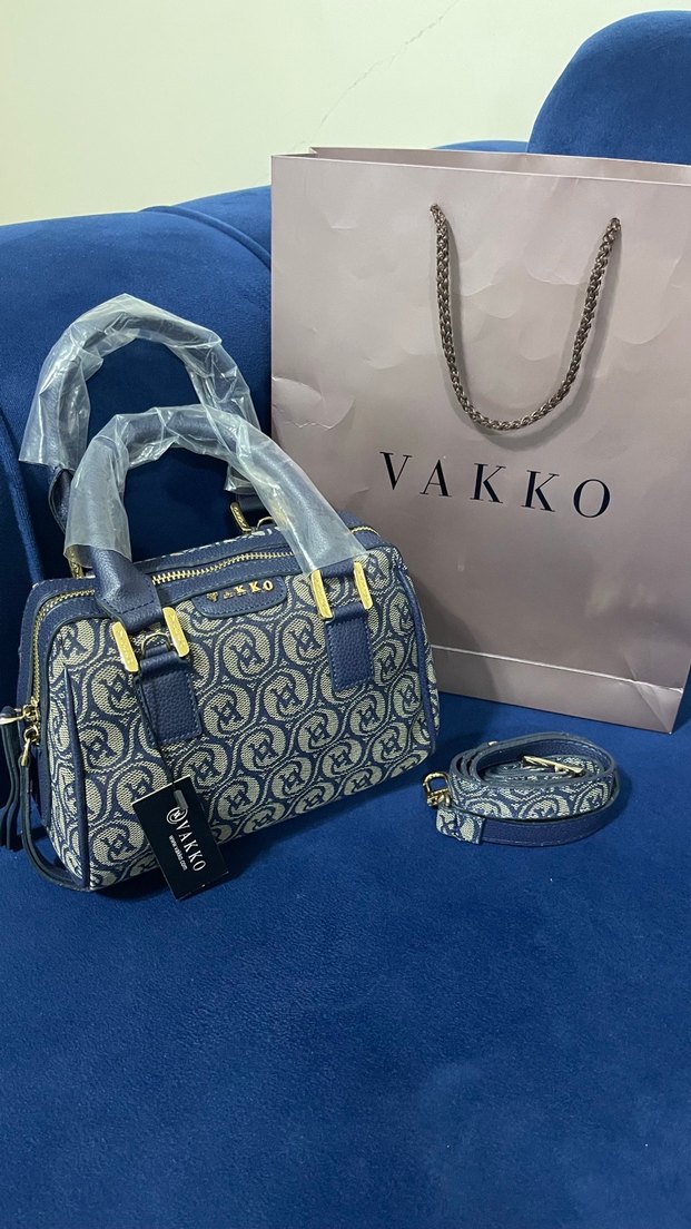 Vakko markalı, sentetik kumaştan, baskılı desenli mavi kadın çantası, kemerli detaylıdır. Sokak tarzı ve günlük kullanıma uygundur.