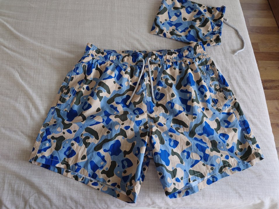 Orjinal Vakko H20 serisi,L beden, Açık mavi kamuflaj desenli, erkek deniz şort. Elastik bel ve bağcık ile rahat kullanım sağlar. Sadece 1 kez giyildi, kalıp küçük geldiği için satılıktır.