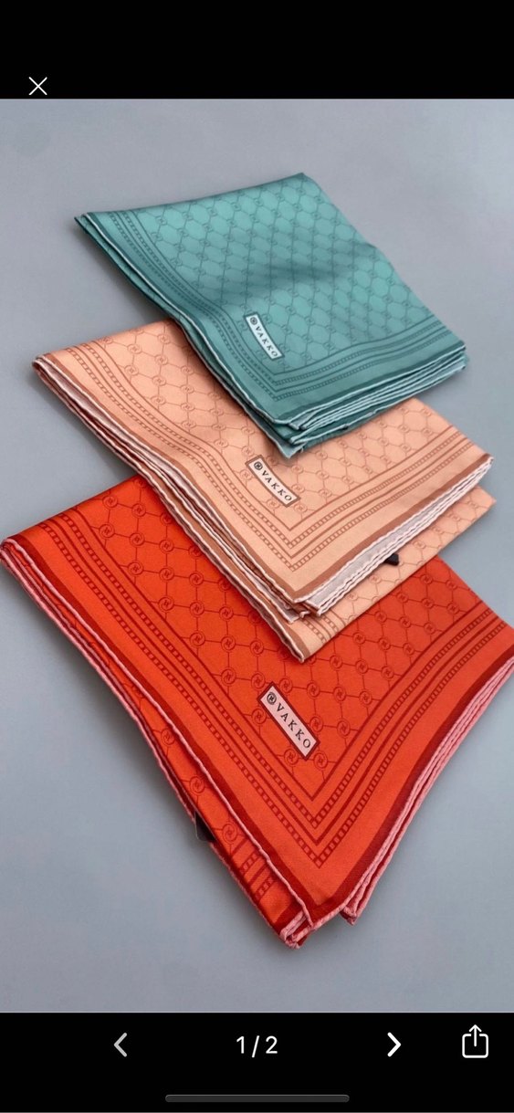 Orjinal monogram desenlere sahip, mavi, şeftali ve turuncu pastel tonlarında klasik tarzda kadın Vakko eşarp .