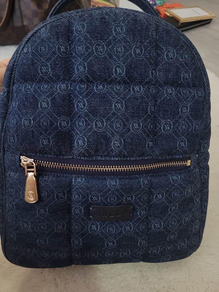 Mavi denim baskılı, parlak görünümlü, fermuarlı cepli kadın sırt çantası, günlük kullanıma uygun, rahat ve şık.Hiç bir sorunu yok bir kaç kez kullanıldı.