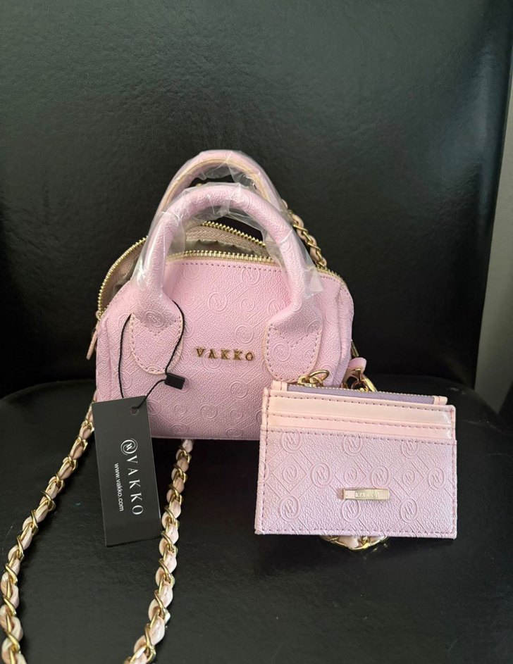 Vakko imzalı, pastel pembe renkte, baskılı desene sahip deri fermuarlı kadın çantasıdır. Trend sokak stili için uygundur ve kartlıkla tamamlanır. Orjinal ürün