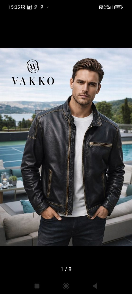 Vakko'dan siyah deri biker ceket, yakalı ve uzun kollu. Normal kesim, tokalı ve fermuarlı ceplerle günlük kullanıma uygun parlak görünüm sunar.