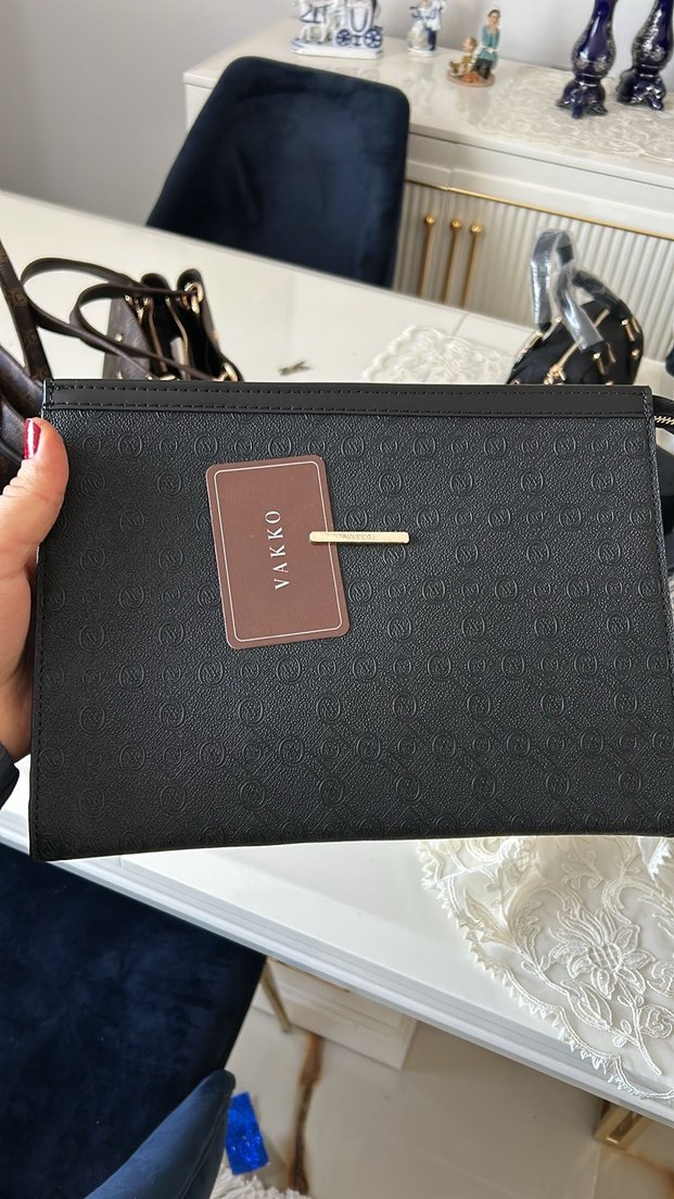 Vakko marka siyah deri kadın çantası, baskılı desene ve fermuarlı kapanışa sahip, modern klasik tarzda günlük kullanıma uygun.