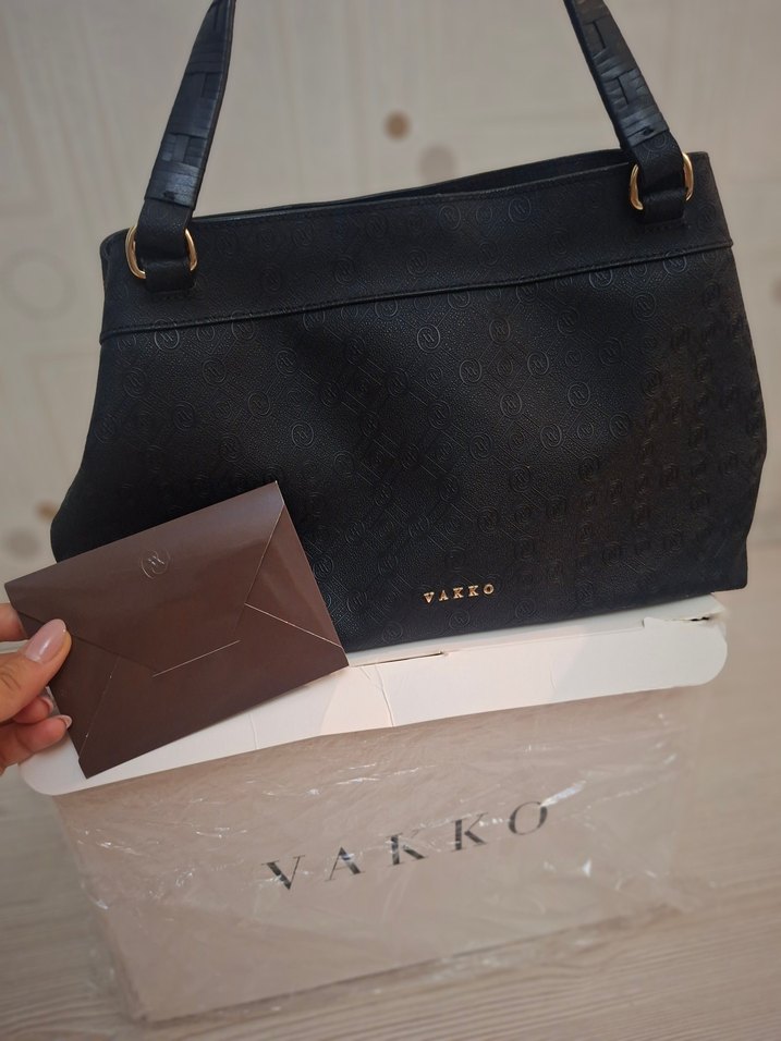 Vakko marka siyah deri kadın çanta, modern klasik tasarım, baskılı detaylar ve tokalı askılarla günlük kullanım için iş şıklığı sunar.
