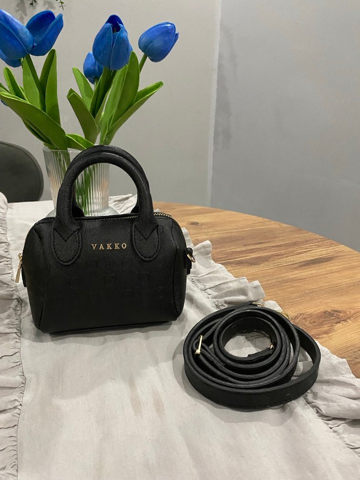 Vakko marka siyah deri kadın çanta, baskılı desene ve fermuarlı kapağa sahip. Trendy casual sokak stiline uygun, şık ve kullanışlıdır.