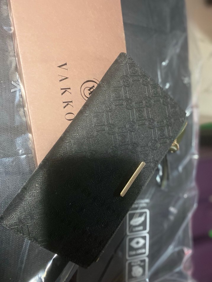 Vakko marka siyah deri kadın cüzdanı, tokalı ve baskılı desene sahip, günlük kullanım ve genç stil için uygun.