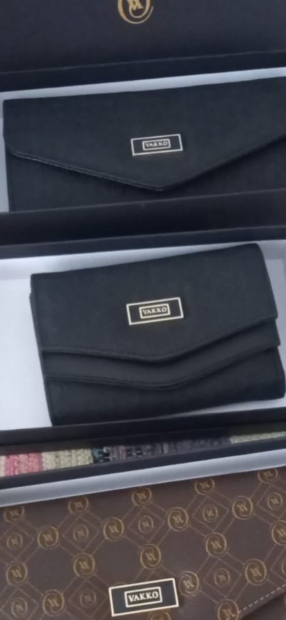 Vakko marka siyah süet kemerli kadın cüzdan, baskılı logo detaylı, minimal günlük sokak stili için uygundur.