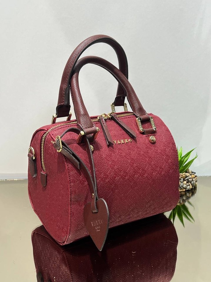 Bordo deri, desenli ve parlak yüzeye sahip kadın çanta. Tokalı sapları ve modern klasik tarzıyla günlük kullanıma uygundur. Toz torbalı A+ Kalite