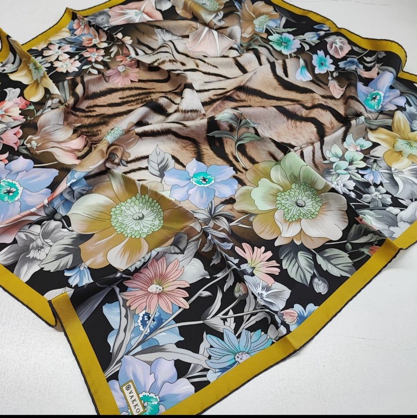Kadınlar için çok renkli, koyu ve canlı geometrik desenlere sahip, drapeli tekstil şal. Çağdaş ve avangart tarz için uygundur.
