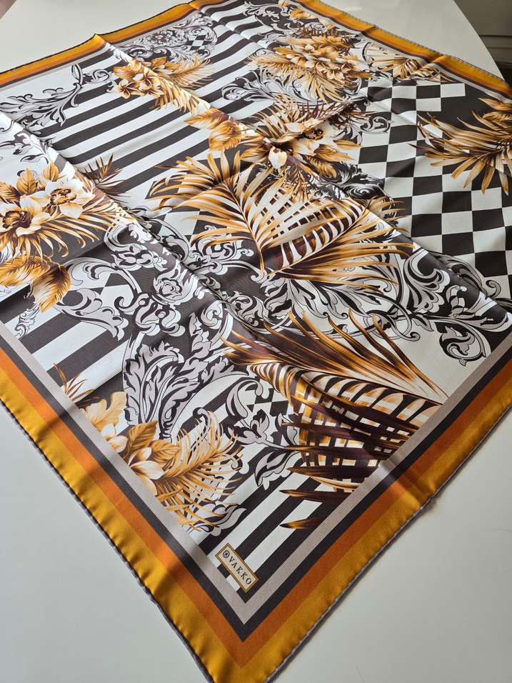 Kadınlar için çok renkli, koyu tonlarda pilili fular. Sentetik kumaştan yapılmış, bohem ve retro tarzını yansıtan çiçek ve geometrik desenlere sahip.