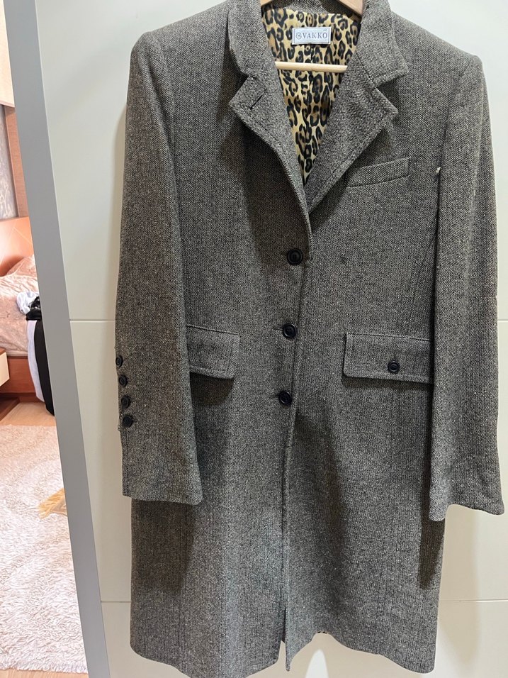 Düğmeli, yün kumaştan yapılmış, gri renkli kadın kaban. Klasik kesim, uzun kollu ve ofis için uygun, iç kısmında yılan desenli astar bulunur. Az giyilmiş temiz Ceket Pantolon. Pantalon kısa paça 94 cm boy. Ceket belden oturtmalı 102 cm boyunda arkası yırtmaçlıdır. Yün pamuk karışımı gabardin kumaştır.