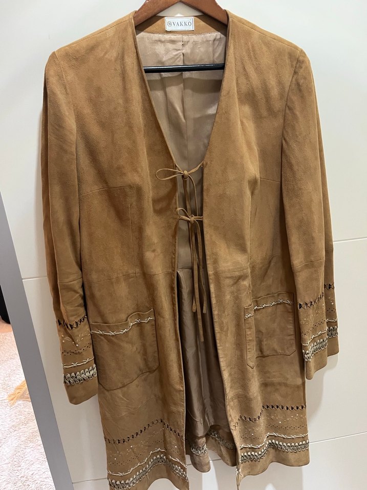 Vakko Süet Deri uzun 94 cm boyunda Ceket/Kap. Kol ve Etek uçları işleme detaylı. Az kullanılmıştır.