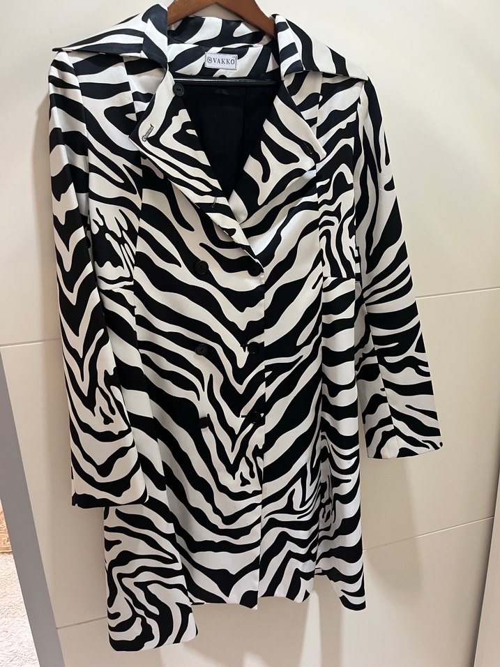 Uzun kollu, V yakalı, Kruvaze düğmeli zebra desenli Blazer. Saten kumaştan yapılmıştır. Boy 97 cm.