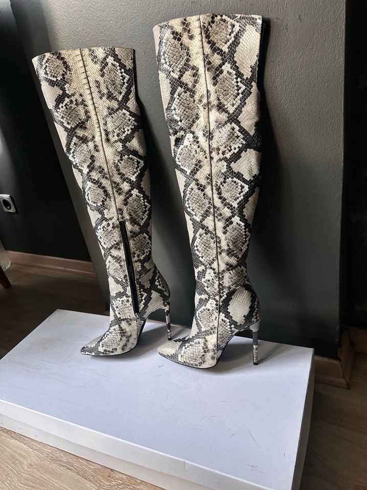 VAKKO Yılan Desenli Gri İnce Topuklu diz üstü Kadın Çizme