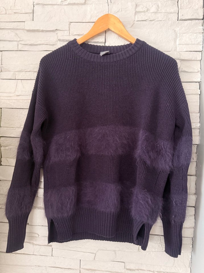 Mor renk, yuvarlak yakalı ve uzun kollu, kürk detaylı rahat kesim triko kazak. Sokak stiline uygun, konforlu bir parça. Orjinal marka defosuz