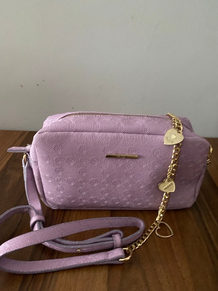 Mor süet malzemeden, işlemeli desenlere ve kalpli altın zincir detayına sahip kadın çantası. Modern klasik ve Paris tarzını yansıtır.