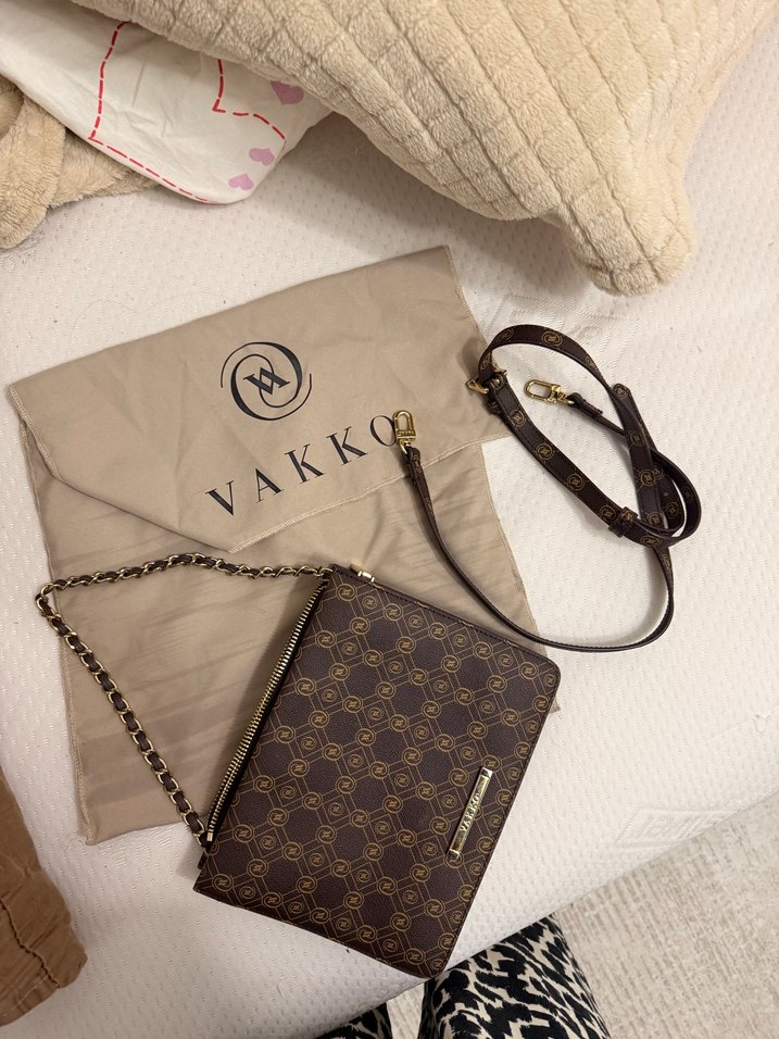 Vakko markalı, zincir detaylı koyu kahverengi baskılı deri çanta, klasik zarafeti modern Paris tarzıyla birleştirir.