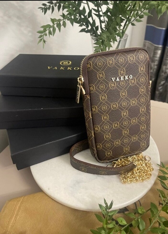 Vakko marka, zincir detaylı, baskılı desenli kahverengi deri çanta, şık ve günlük kullanıma uygun.
