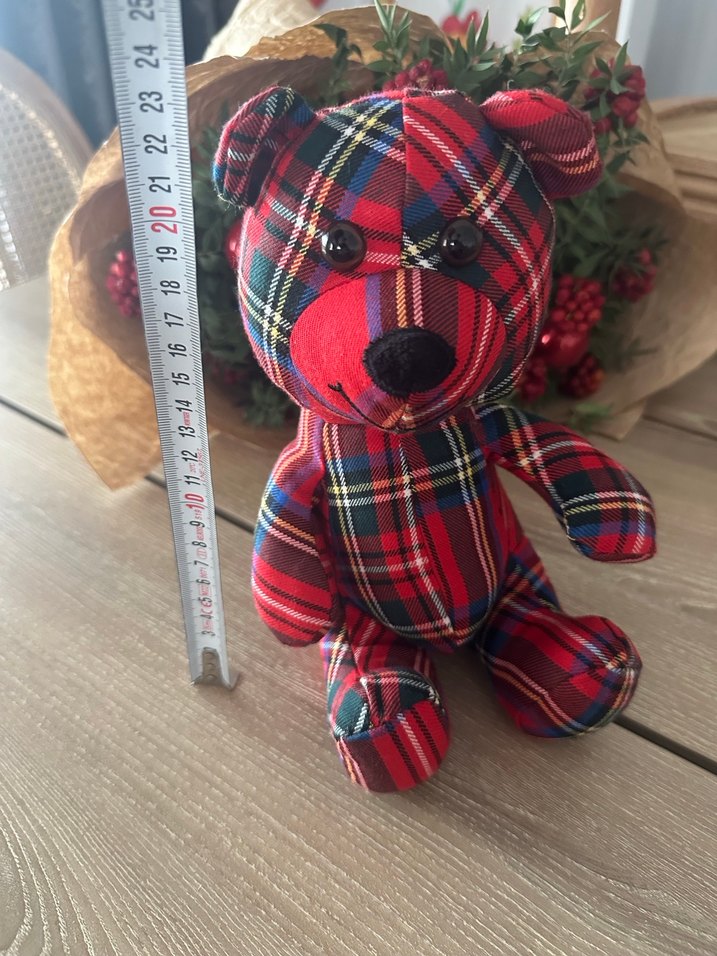 Vakkorama ayısının muadili Renkli ekoseli desene sahip, düğme gözlü peluş ayı oyuncak, yaklaşık 23cm boyundadır.