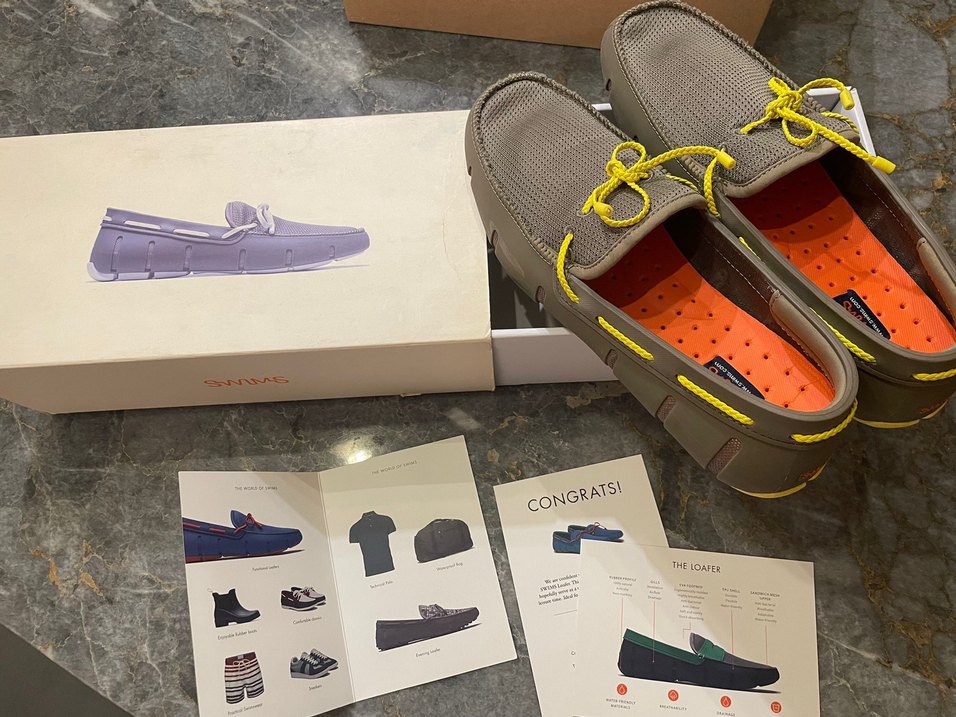 Kahverengi spor ayakkabılar, nefes alabilen file üst yüzey ve parlak sarı bağcıklarla athleisure tarzına uygun. Kutuda ürün bilgileri ve tebrik notu bulunur.