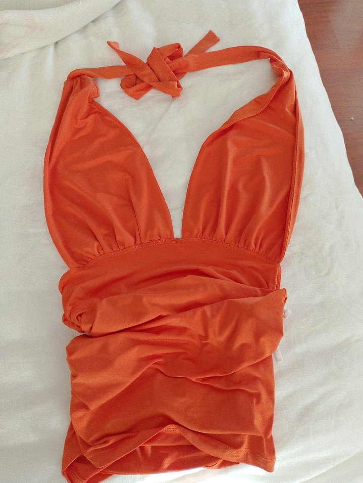 Kadınlar için drapeli, sırt bağlamalı, parlak turuncu renkte, derin V yakallı