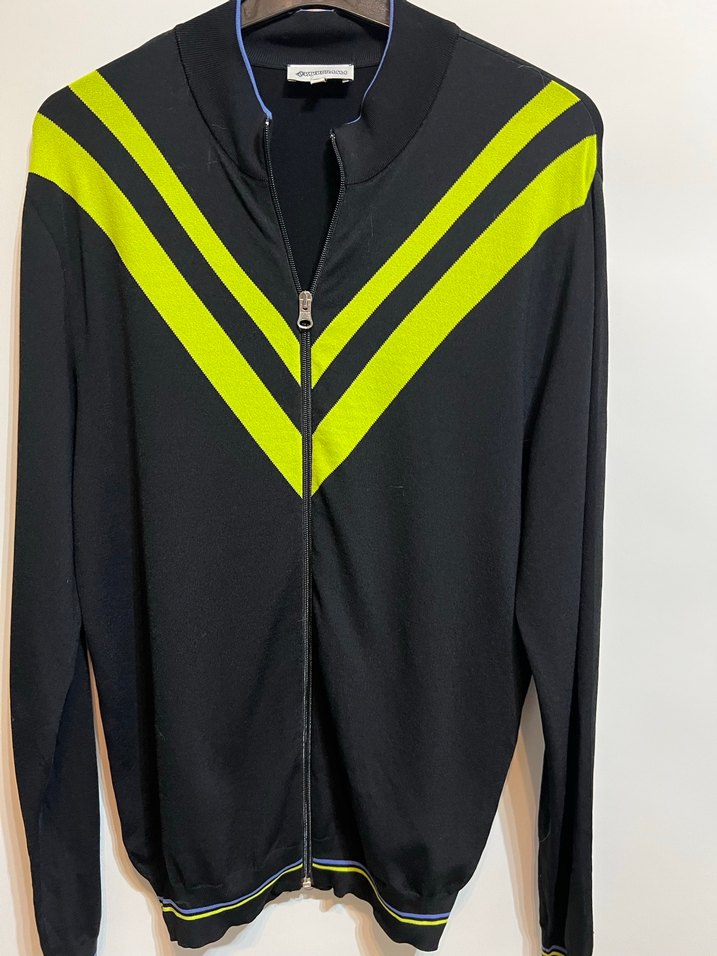 Uzun kollu, fermuarlı ve yüksek yakalı kadın spor hırka. Koyu renk üzerine sarı V şeklinde çizgiler bulunur. normal boydadır esnek bir trikodur