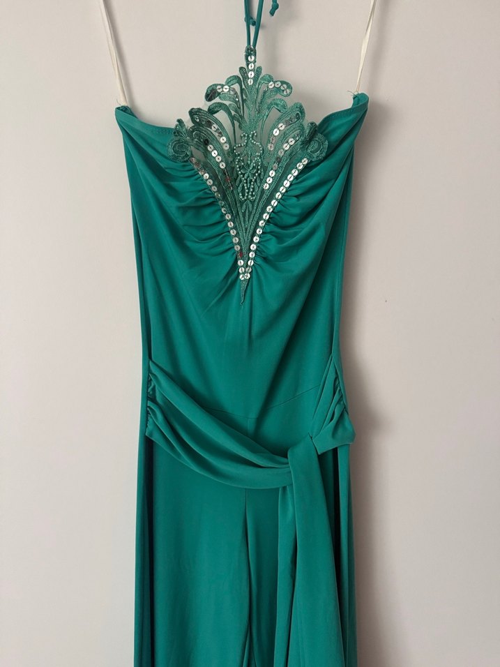 Vakkoroma marka turkuaz renkte, straplez yakalı ve drapeli uzun abiye tulum. Nakışlı ve parlak detaylarla süslenmiş, klasik ve şık kesime sahip, kolsuz tasarım. ✨