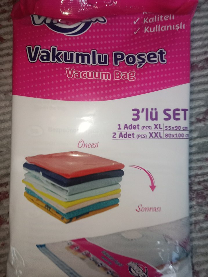Kaliteli ve kullanışlı vakumlu poşet 3'lü set, 1 adet XL (55x90 cm) ve 2 adet XXL (80x100 cm) boyutlarında.