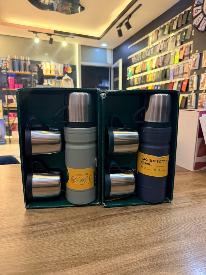850 ml kapasiteli, vakumlu iki termos ve her biri için iki paslanmaz çelik bardak içeren set. Termoslar haki ve gri renktedir, içecekleri sıcak veya soğuk tutar.