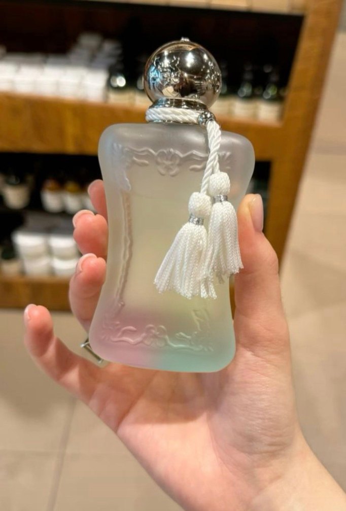 Buzlu cam şişe, beyaz püsküller ve gümüş kapaklı kadın parfümü. Zarif tasarımı klasik bir dokunuş katıyor. 5.10 ml sorunuz