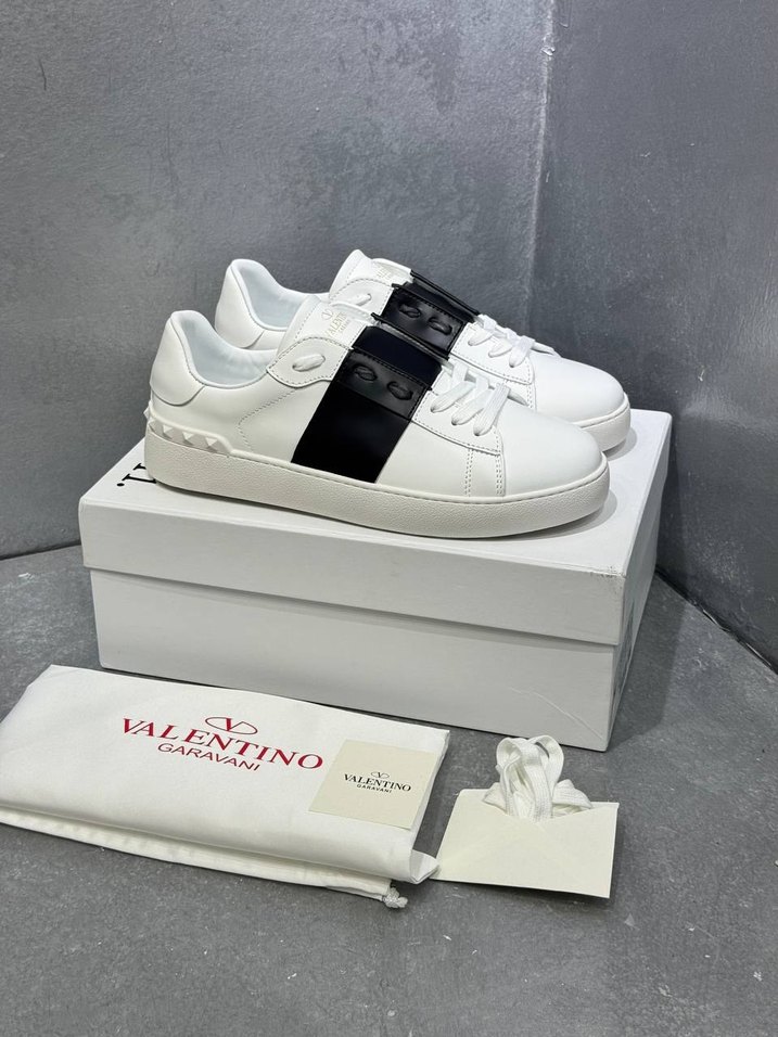 Valentino beyaz spor ayakkabılar, koyu renkli baskılı kauçuk bant ve Velcro detaylı, stiletto topuklu, trend sokak stiline uygun.