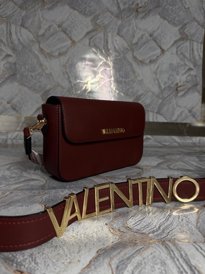 Bordo renkli, kemerli tasarıma sahip deri kadın çantası. Modern klasik stil ve baskılı desenle romantik akşamlar için ideal. Valentino logosu Paris şıklığını yansıtıyor.