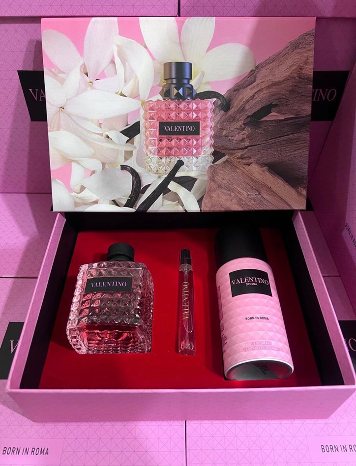 Valentino Born In Roma kadın parfüm seti; dokulu cam şişe, küçük sprey ve uyumlu vücut spreyi içerir. Kutusu çiçek ve ahşap desenlidir.