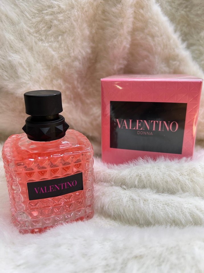 Valentino Donna kadın parfümü, siyah kapaklı, dokulu pembe şişede ve uyumlu pembe kutuda. Şık bir koku seçeneği.