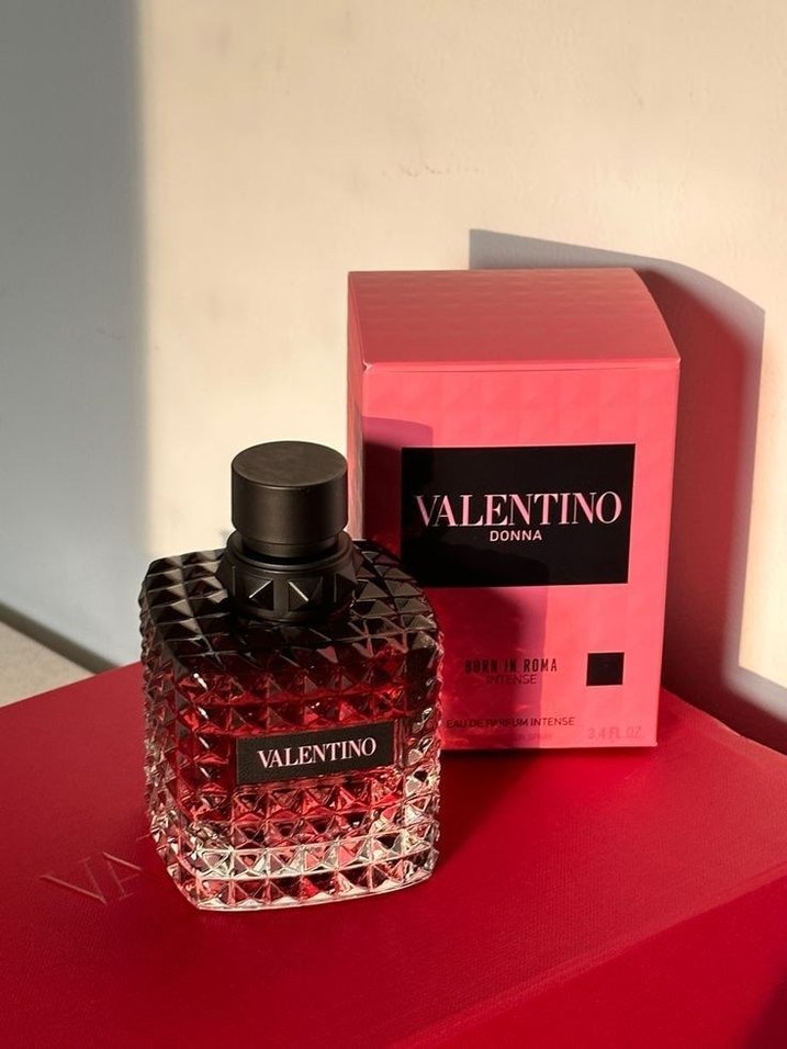 Valentino Donna parfümü, dokulu cam şişede ve pembe kutuda sunulur, yoğun bir koku deneyimi sağlar.