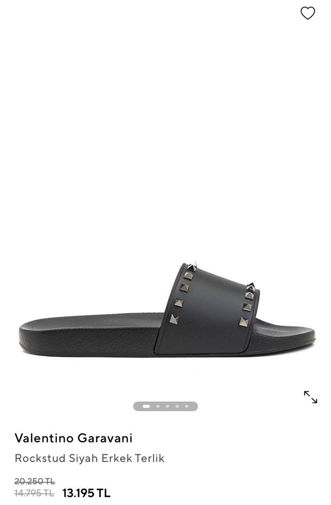 Valentino Garavani'nin siyah, parlak kauçuk malzemeden, kemerli ve çivili detaylara sahip erkek terliği. Sokak stili için uygundur. Çivilerden bir düştü yedeklerini yanında gönderiyorum kolaylıkla takabilirsiniz. Modelin adı Rockstud, orijinaldir.